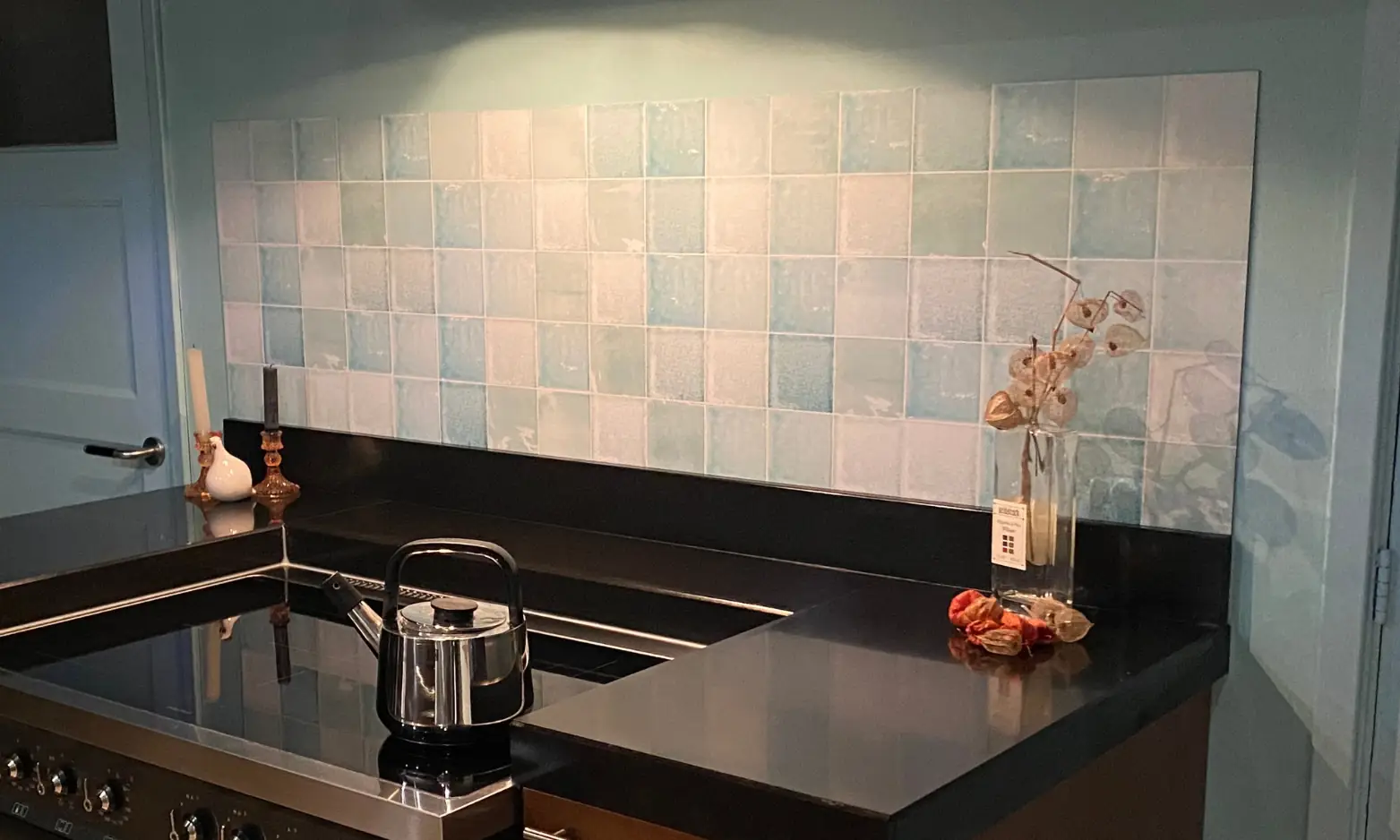 Yes, all three materials are moisture-resistant and suitable for bathrooms. DW Glass is especially popular in wet areas due to its smooth, fully waterproof surface. The turquoise colour is perfect for a wellness-style bathroom.