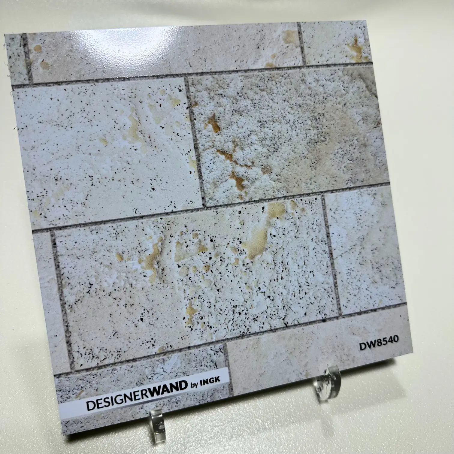 Ja, de hoge resolutie print geeft een realistische kalksteen-uitstraling met natuurlijke kleurvariaties per tegel. Het grote voordeel: je hebt geen voegen, geen onderhoud en geen risico op vlekken zoals bij echte natuursteen.